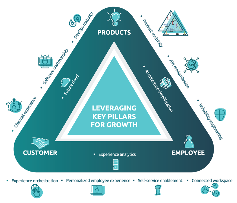 Capgemini’s Framework of the Future helps companies focus on three fundamental pillars of business success: products and services, customers, and employees.