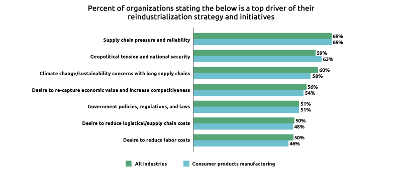 Supply chain resilience is paramount – 69 percent of consumer product manufacturers identify it as the primary driver behind their reindustrialization efforts. This emphasis on stability is further underscored by 63 percent citing geopolitical tensions and national security as key concerns, motivating a strategic shift towards domestic production.
