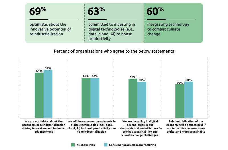 Technology is the cornerstone of the industry’s revitalization. Nearly 70 percent of consumer product manufacturers are optimistic about the innovative potential of reindustrialization and 63 percent are committed to investing in digital technologies to boost productivity. Notably, 60 percent are integrating technology specifically to combat climate change, recognizing the interconnectedness of digitalization and sustainability for achieving success.