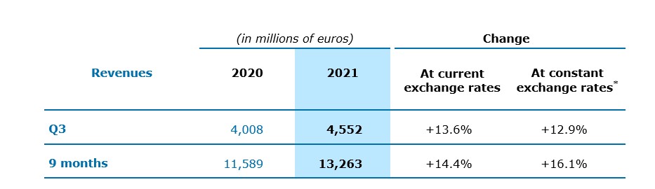 Paris, October 28, 2021 – Capgemini Group reported consolidated revenues of €4,552 million in Q3 2021, up 13.6% year-on-year at current exchange rates and 12.9% at constant exchange rates*.