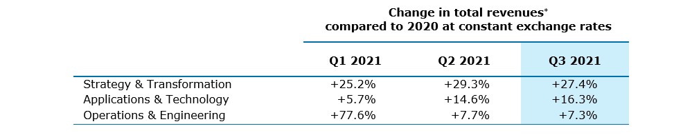 All business lines continued to report strong growth, in line with Q2 trends. Strategy & Transformation services (7% of Group revenues) and Applications & Technology services (62% of Group revenues and Capgemini’s core business) benefited fully from Digital and Cloud demand, reporting growth at constant exchange rates of +27.4% and +16.3%, respectively. Operations & Engineering services (31% of Group revenues) also maintained a solid momentum, reaching double digit after adjusting for the scope effect of the Odigo divestiture. This performance was once again driven by growth in Engineering services of well above 10%.