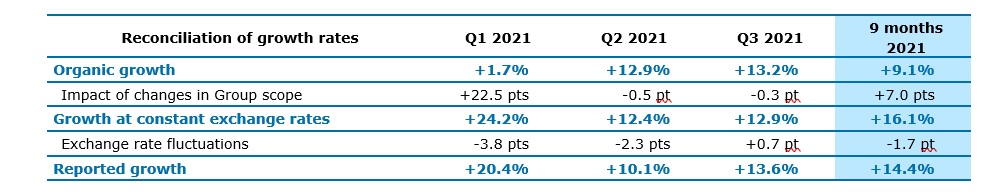 Capgemini growth accelerated further in Q3 2021. With Q3 2021 revenues of €4,552 million, constant currency growth was +12.9% year-on-year, exceeding Q2 growth of +12.4%. Organic growth (i.e. adjusted for Group scope and exchange rates) was +13.2% year-on-year, compared with +12.9% in Q2. This performance is all the more remarkable as the comparison base was much higher in Q3.