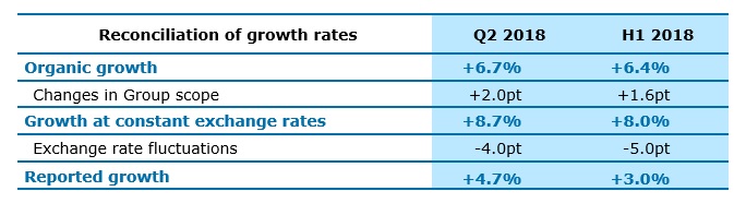 The Group generated revenues of €6,467 million in H1 2018, up 3.0% on H1 2017 reported revenues and 8.0% at constant exchange rates*. Organic growth* (i.e. excluding the impact of currency fluctuations and changes in Group scope) was 6.4%.