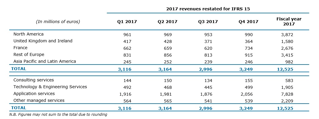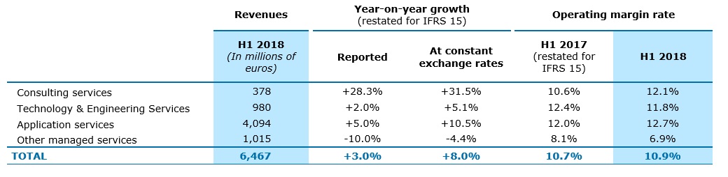Application Services (63% of Group revenues), fueled by the customer demand related to the new needs in the Digital and Cloud, posted revenue growth of 10.5% at constant exchange rates. North America, France and the Rest of Europe reported the strongest momentum. The operating margin rate is 12.7%, up 70 basis points.