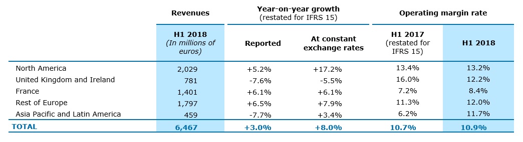 The Asia-Pacific and Latin American region (7% of Group revenues) reported growth of 3.4% at constant exchange rates. In Asia-Pacific, which accounts for around three-quarters of activity in this region, growth was fueled by the Consumer Products, Financial Services and Public sectors. Latin America remained broadly stable over the period, with the economic environment that remains weak in Brazil and solid growth in Mexico. With Latin America’s activities returning to profit, the operating margin for the region as a whole improved rapidly, from 6.2% in H1 2017 to 11.7% this year.