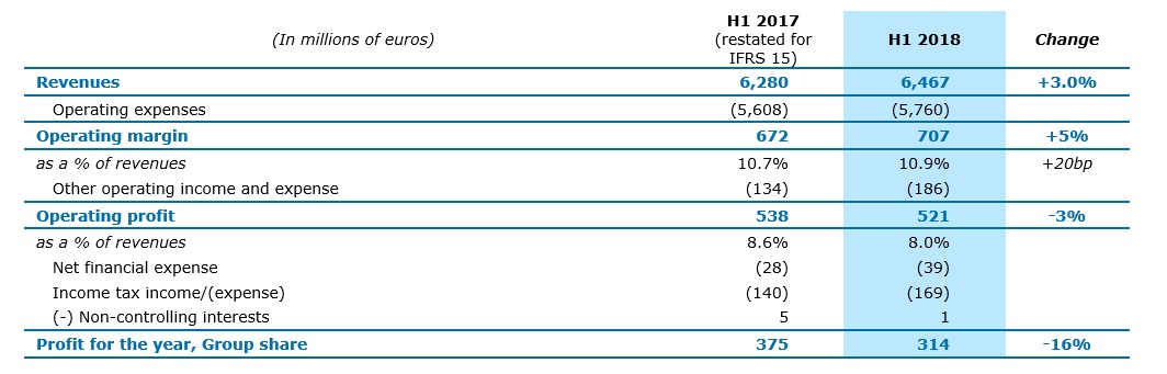 The operating margin* is €707 million, up 5% on H1 2017. It represents 10.9% of revenues, an increase of 20 basis points year-on-year mainly driven by to the profitability improvement in continental Europe.