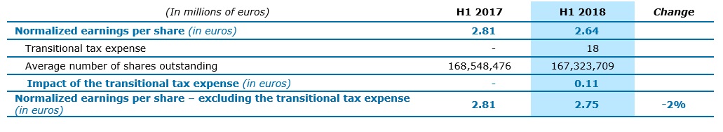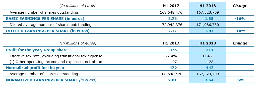 Net profit (Group share) amounted to €314 million for H1 2018, compared with €375 million in H1 2017. Basic EPS (earnings per share) is €1.88 and Normalized EPS* is €2.64 and €2.75 adjusted for this transitional tax expense.