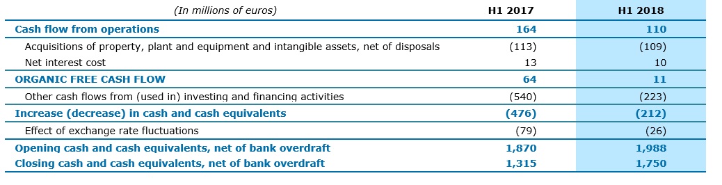 The Group generated organic free cash flow* of €11 million in H1 2018 compared with €64 million in the prior-year period. This variation is notably attributable to early unwinding of hedging instruments that contributed €24 million in 2017 and higher tax payments in 2018 for €23 million.