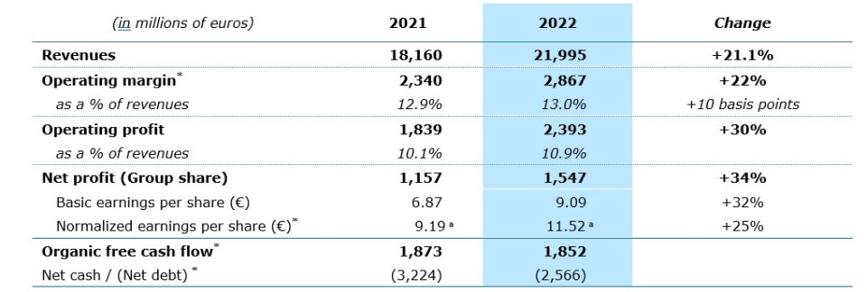The operating margin* increased by +22% to €2,867 million, representing 13.0% of revenues, compared with 12.9% in 2021. This 10-basis point improvement is consistent with the 2022 target of an increase of 0 to 20 basis points. A shift in the project mix, towards more innovative and value creating offers, more than offset the post-pandemic return of some operating costs – such as travel and facilities costs – and the higher cost of developing Group talent.