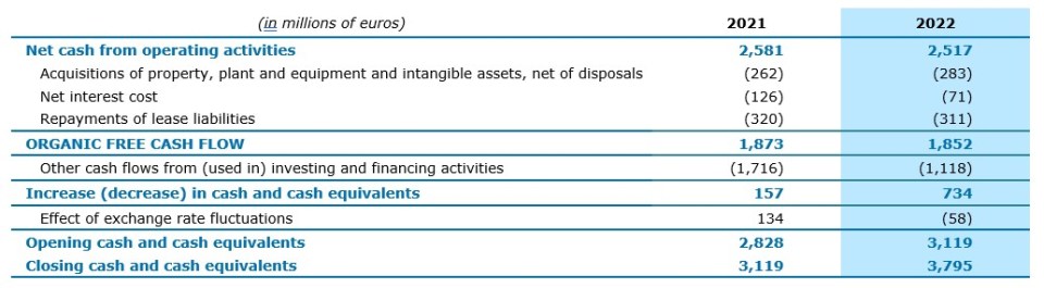 Organic free cash flow* is above €1,700 million, as targeted for 2022, and reaches €1,852 million.