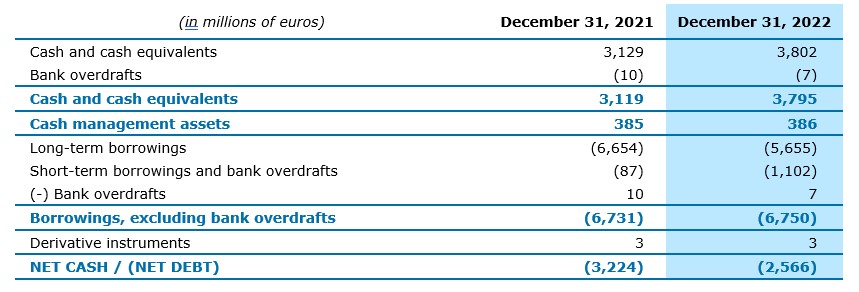 At December 31, 2022, the Group had cash and cash equivalents and cash management assets of €4.2 billion. After accounting for borrowings of €6.8 billion and derivative instruments, Group net debt* is €2.6 billion at December 31, 2022, down compared with €3.2 billion at December 31, 2021.