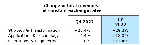 All Group business lines reported stronger than expected growth in Q4, although slightly lower than in previous quarters. Strategy & Transformation services and Applications & Technology services reported growth at constant exchange rates of +25.4% and +14.4%, respectively. Operations & Engineering services revenues grew +13.0% at constant exchange rates.