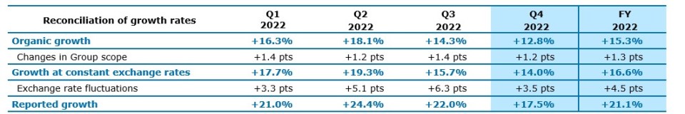 The Group reported revenues of €21,995 million in 2022, up +21.1% vs. 2021 published figures. Constant currency growth* was +16.6%, above the 2022 target range of +14% to +15%, which was revised upwards on the publication of the half-year results. As acquisitions contributed +1.3 points to growth, organic growth* (i.e. excluding the impact of currency fluctuations and changes in Group scope) reached +15.3%.