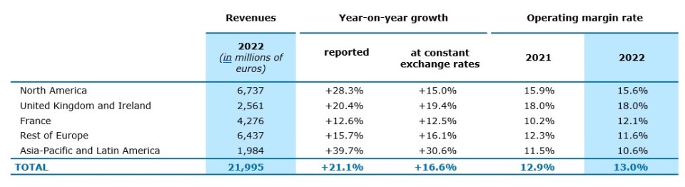 Finally, revenues in the Asia-Pacific and Latin America region (9% of Group revenues) increased sharply by +30.6%, boosted by 2021 Group acquisitions in the region and solid underlying organic momentum in the Financial Services and Manufacturing sectors. The operating margin was 10.6% compared with 11.5% in 2021.