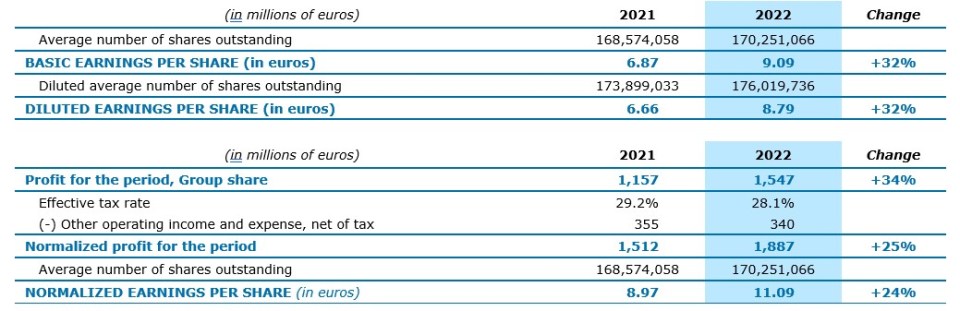 Net profit (Group share) is therefore up by +34% year-on-year to €1,547 million, while basic earnings per share increased by +32% to €9.09. Normalized earnings per share* is €11.09. Normalized earnings per share adjusted for the transitional tax expense is €11.52, up +25% year-on-year.