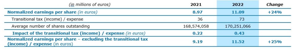 The Group recognized a tax expense of €73 million in 2022, compared with €36 million in 2021, in respect of the transitional impact of the 2017 US tax reform. Adjusted for this transitional tax expense, normalized earnings per share is €11.52 in 2022: